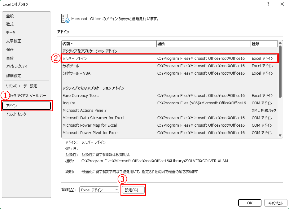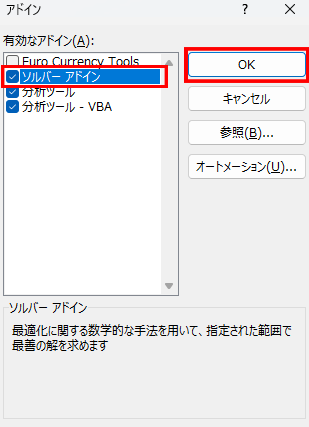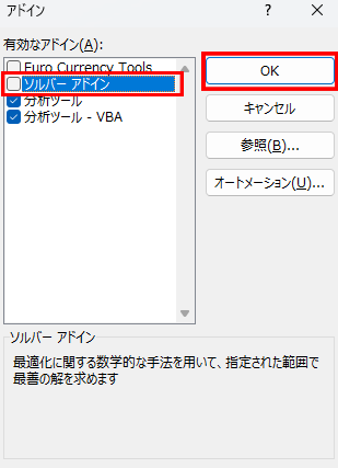 (4)再度(1)からの手順から「アドイン」画面を開き、「ソルバー アドイン」 にチェックを入れて 「OK」 をクリックします。