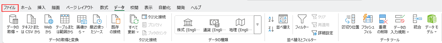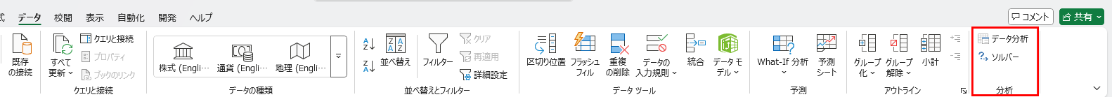 (5)Excelの 「データ」 タブに「ソルバー」が表示されていることを確認します。