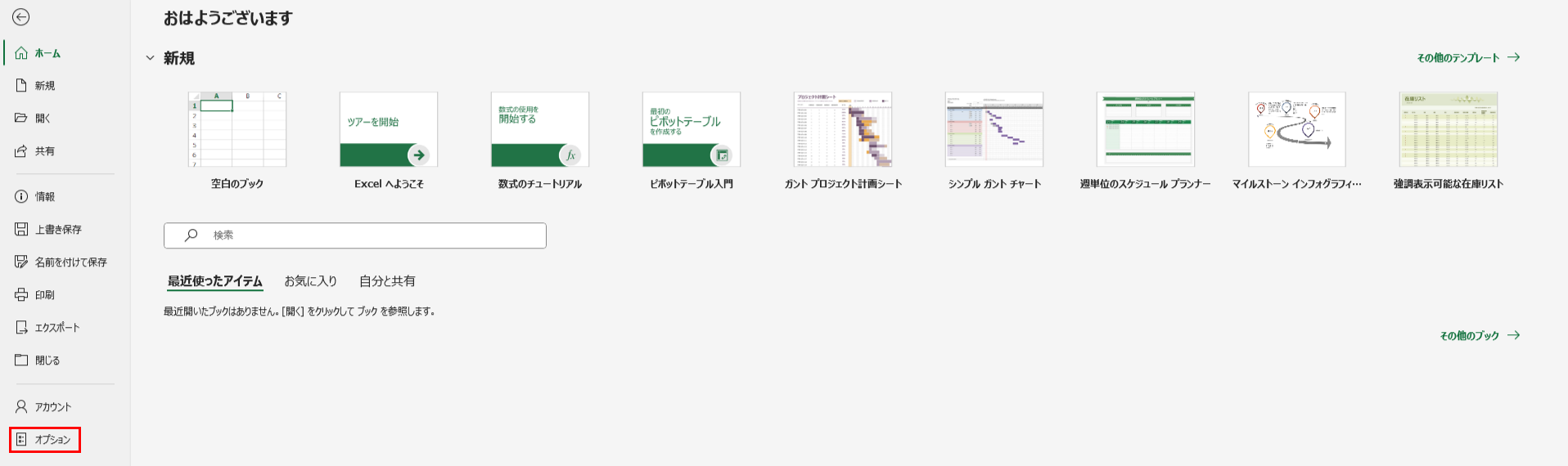 (1)画面左上の「ファイル」を選択し左側メニューから「オプション」を選択。